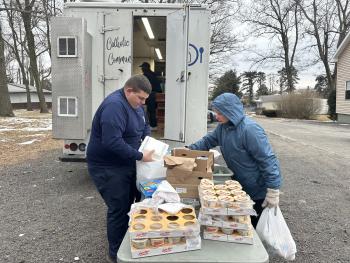 Pat Smith, Campus Minister at Marian Catholic High School, Tamaqua, engages in community service right along with his students, assisting with the Catholic Charities Food Truck. “Our mission in Campus Ministry is helping students develop a personal relationship with Christ in the Eucharist and then helping them take that relationship out into the world,” he said.