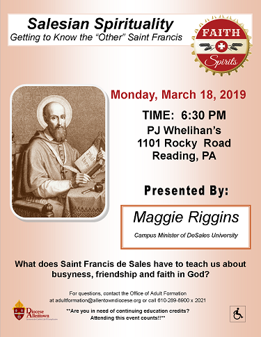 Join us on Monday, March 18, 2019, from 6:30 to 8:30 pm at PJ Whelihan's in Reading as Maggie Riggins explores the Spirituality of Saint Francis de Sales. Who is Saint Francis de Sales? What does he have to teach us about busyness, friendship, and faith in God? These questions and more will be discussed. There is no cost to attend and no registration is required. PJ Whelihan's is located at 1101 Rocky Rd, Reading and they will have menus available for ordering food and drink at your expense. For questions contact the Office of Adult Formation by email at [email protected] or call 610-289-8900, Ext. 2021