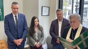 “I’m glad that our Catholic community can be a partner with Miller-Keystone,” said Bishop Schlert, just before he blessed the medallions at the blood center’s Hamilton Street location in Allentown.